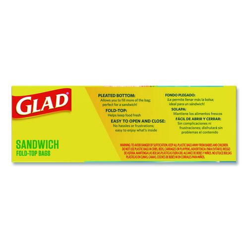 Glad® food storage bags with sandwich fold top are just the right size for taking your sandwich to work, school or the park. These multipurpose bags are not just for lunch though. Bags are the perfect size for packing snacks for school, keeping your small travel items together, or saving cut fruits and veggies. These bags have pleated bottoms, which allow you to fill the bag with more. The fold lock top helps to keep your food fresh and items secure, but are still easy to open and close without frustration. Bags are made without BPA.