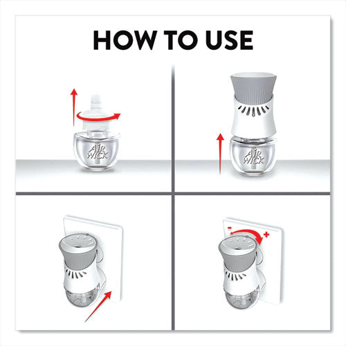 Leave a lasting impression on guests and ensure a consistent experience with Air Wick Scented Oil Refills with Essential Oils. Keep supply rooms stocked with the pleasant scents your guests come to associate with your business. Get up to 60 days per refill, on the lowest warmer setting, of natural-smelling fragrance with essential oil-infused formulas. Easily refill the Air Wick plug-in warmer by unscrewing the cap and inserting the refill until it clicks. Adjust the warmer settings to ensure the optimal fragrance for each room. Enhance entrances, common areas, offices, breakrooms and guest rooms with pleasant scents.