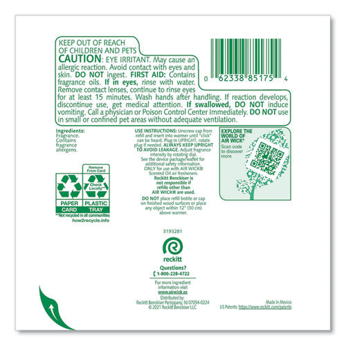 Leave a lasting impression on guests and ensure a consistent experience with Air Wick Scented Oil Refills with Essential Oils. Keep supply rooms stocked with the pleasant scents your guests come to associate with your business. Get up to 60 days per refill, on the lowest warmer setting, of natural-smelling fragrance with essential oil-infused formulas. Easily refill the Air Wick plug-in warmer by unscrewing the cap and inserting the refill until it clicks. Adjust the warmer settings to ensure the optimal fragrance for each room. Enhance entrances, common areas, offices, breakrooms and guest rooms with pleasant scents.